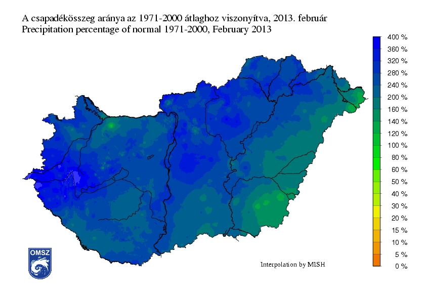 A februári jelentős csapadéktöbbletet 2. ábránk is jól szemlélteti. Az ország területén mindenhol több csapadékot regisztráltunk a normálnál, átlagosan a megszokott mennyiség 261%-a hullott le az országban. A legnagyobb havi csapadékösszeget a Zala megyei Kehidakustányból jelentették (148,1 mm), mely a település környékén megszokott összeg mintegy négyszerese. Az ország legszárazabb részén, DK-en is a megszokott mennyiség 120-180%-a hullott. A legalacsonyabb havi összeget a Békés megyei Orosházán regisztráltuk (31,6 mm).
