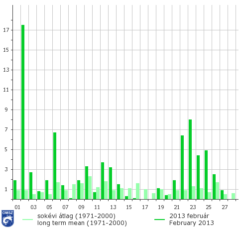 A hónap legcsapadékosabb napja február 2-a volt. Európa felett egy hatalmas méretű, több középpontú ciklonrendszer helyezkedett el, mely a kontinens legnagyobb részén borult, csapadékos időjárást eredményezett. Hazánkban a legtöbb helyen 10 és 35 mm közötti csapadékmennyiségeket jelentettek ezen a napon. A legnagyobb 24 órás csapadékösszeg is ehhez a naphoz köthető, Szabolcs megyei Kemecse állomásunkról 48,7 mm-ről érkezett jelentés, mely egyben új napi rekord is. A harmincéves átlagot tekintve hazánkban általában a február a legszárazabb hónap, a 24 óra alatt lehullott csapadékmennyiség tekintetében ez az új rekord februárban rendkívülinek számít. A megszokottnál jóval csapadékosabbnak bizonyult még február 6-a is, de kiemelkedő értékek jellemezték a 22-25. közötti időszakot is. A hónap utolsó napjaiban az országban többfelé árvízvédelmi készültséget rendeltek el. A csapadék sokéves napi maximumának rekordja 25-én is megdőlt Lentiben (Zala) 36 mm értékkel.