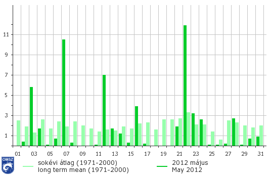 A napi csapadékösszegek ábráján szépen látszanak a májusban hazánkat érintő frontrendszerek csapadékai. Országos átlagban 9 napon jelentkezett a normált meghaladó napi összeg, május 3-án, 7-én, 12-én és 22-én pedig kiemelkedő csapadékokat mértünk, ezeken a napokon 5 mm-t meghaladó országos átlagok jelentkeztek. A legcsapadékosabb nap a hónapban 22-e volt, amikor országos (közel 12 mm) és állomási (89,8 mm, Pécs Pogány) szinten is a legtöbb eső hullott.