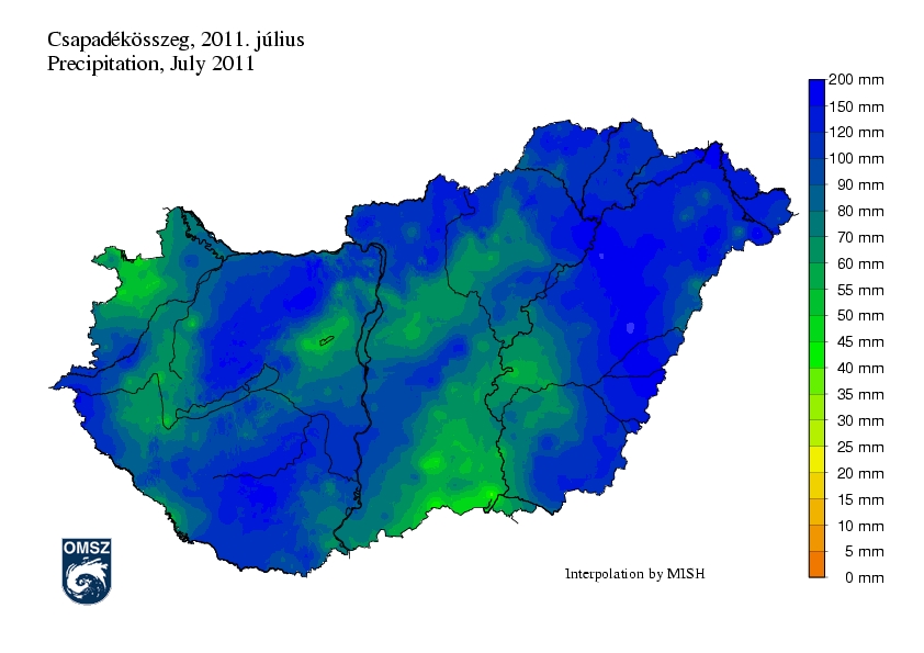 A júliusi havi csapadékösszeg országszerte meghaladta a 30 mm-t. 100 mm fölötti összeg a Dunántúli-középhegység, a Mecsek és a Tiszántúl régióiban esett. A legnagyobb értékek a Tiszántúlon jelentkeztek, helyenként a 180 mm-t is meghaladva.