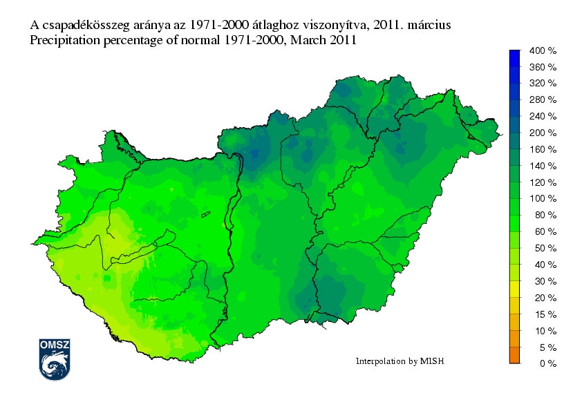 A sokéves átlagnál szárazabb a Dunántúl szinte teljes területe és a Tiszántúl középső része volt. A Dunántúl délnyugati részén a lehullott csapadék a sokéves átlag 50%-át sem érte el. A szokásoshoz képest csapadékosabb területeken a legnagyobb különbség Nógrád megyében jelentkezett. Itt a sokéves átlagérték kétszeresénél is több csapadékot mértünk.