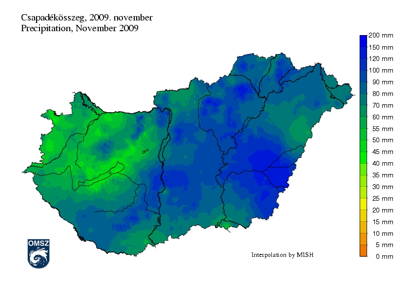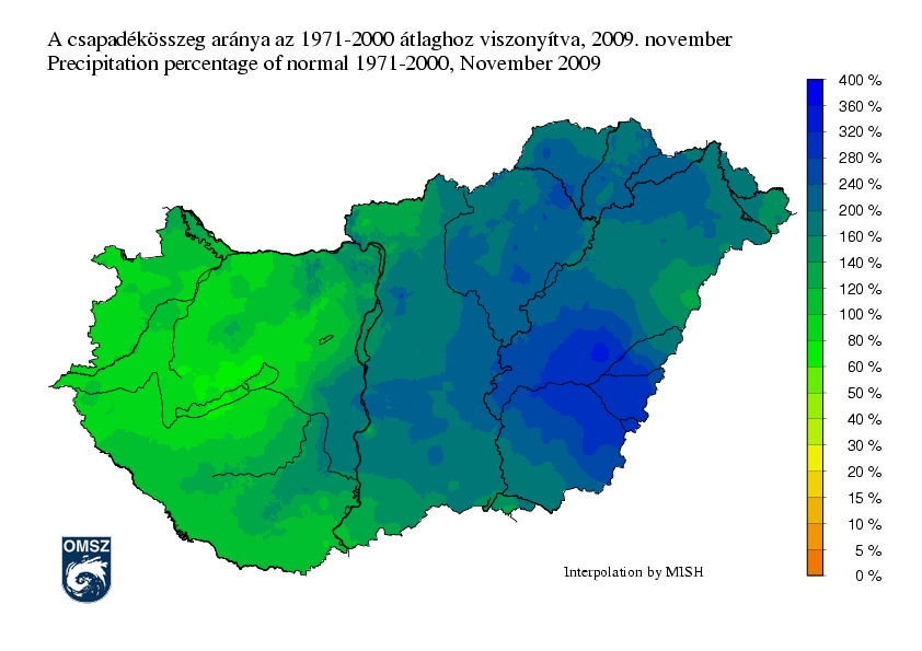 Az ország nagy része ebben a hónapban csapadékosabb volt az átlagnál. Szárazabb területek csupán a Dunántúl északi részén fordultak elő, a legnagyobb különbség a Balaton térségében jelentkezett, az itt lehullott csapadék az átlag 60-80%-a volt. A Dunántúl déli részén és a Dunától keletre a novemberi csapadékösszeg aránya a sokéves átlaghoz képest általában 120-240% között alakult, de a Tiszántúlon ennél magasabb értékek is előfordultak, különösen a Körös mentén, ahol az átlag háromszorosánál is több csapadék hullott.