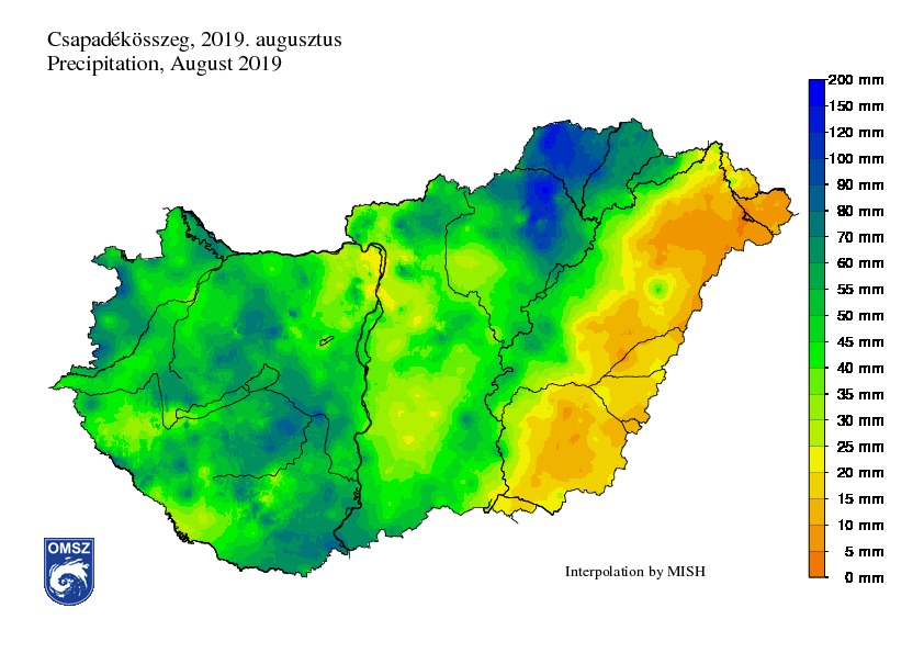 Az augusztus összességében száraz időjárású volt, noha jelentős területi különbségek adódtak. A havi csapadékösszeg országos átlagban 43,2 mm-nek adódott, amely a sokévi átlag mindössze 69%-a. Ebben a hónapban a Tisza vonalától keletre, különösen Szabolcs-Szatmár-Bereg megyében alig esett csapadék, a havi összeg 10 mm alatt maradt. Fehérgyarmaton és Kondoroson egész augusztusban mindössze 3,1 mm-t összegeztünk. Ugyanakkor Borsod-Abaúj-Zemplén megyében a heves zivatarok és felhőszakadások miatt a csapadék térben és időben koncentráltan érkezett. A Bükk keleti és déli előterében, illetve a Cserehátban a hónap során lehulló csapadék mennyisége meghaladta 100 mm-t. A legnagyobb havi csapadékösszeget előzetes adatok szerint Szőlősardó állomáson összegeztük (171 mm), míg Varbón 169,3 mm adódott. Egy-egy nap özönvízszerű csapadék okozott pusztítást, néhol dió- és tojásméretű jéggel. Bükkzsércen augusztus 1-én 24 óra alatt 110,6 mm zúdult le, míg Varbó állomáson augusztus 13-án a napi csapadékösszeg elérte a 126 mm-t.