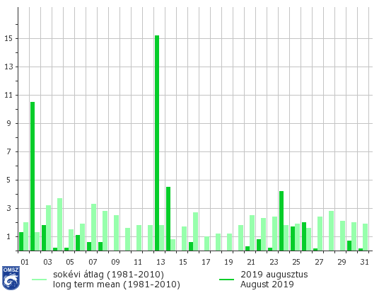 Augusztus első napjaiban a medencét kitöltő nedves, labilis légtömegek hatására helyi záporok, zivatarok több településen hoztak jelentős, legalább 20 mm-t meghaladó mennyiségű csapadékot. A napi csapadék országos átlaga augusztus 2-án elérte a 11 mm-t. Az augusztusi hőhullám idején az egész országban nyugodt száraz, napsütéses időjárás uralkodott, azonban az érkező hidegfront hatására újra többfelé kiadós eső érkezett: augusztus 13-án hullott a havi csapadék jelentős része, sok helyen annak többszöröse. Ezen a napon számos településen pusztított felhőszakadás és jégeső. Az utolsó dekád első felében egy hullámzó frontrendszer hozott újra némi csapadékot, azonban a hónap végére újra csapadékmentessé vált az időjárás.