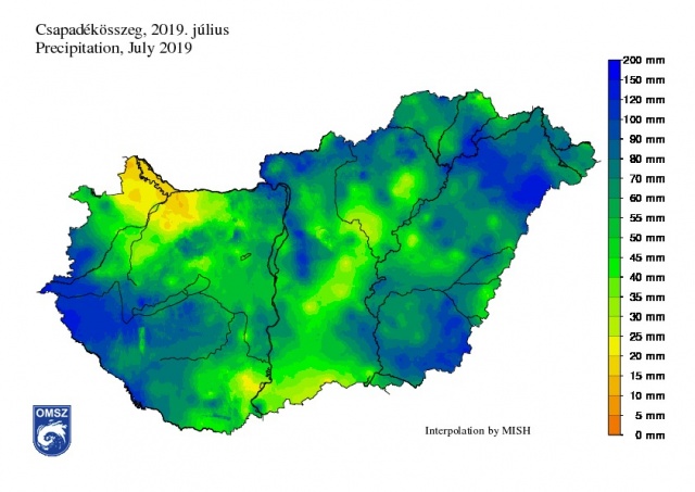 A júliusi csapadékösszeg országos átlagban 63,4 mm-nek adódott, amely a sokévi átlagnál csupán 1%-kal kevesebb, ugyanakkor a csapadék területi eloszlása idén is szélsőségesen alakult. Júliusban ezúttal a Kisalföldön érkezett kevés csapadék: a havi csapadékösszeg jellemzően 20 mm alatt maradt. A legkevesebb csapadékot Hegyeshalom állomáson mértük (12,8 mm). Ugyanakkor a heves zivatarok, felhőszakadások miatt a Dunántúl nyugati tájain, de Magyarország számos állomásán is jóval 100 mm feletti havi csapadékmennyiséget összegeztünk. Különösen csapadékos időjárás jellemezte Szabolcs-Szatmár-Bereg megyét: Bátorligeten júliusban összesen 158,5 mm érkezett. A csapadék időbeli eloszlása itt igen szélsőségesen alakult, mivel 24 óra alatt, július 27-én ebből 111,2 mm érkezett, ami a teljes havi összeg 70%-a.