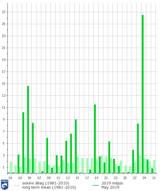 Országos átlagban 132,9 mm csapadék hullott májusban, ami az 1981-2010-es átlag 213%-a. Ezzel a 2019-es a 3. legcsapadékosabb május 1901 óta, mindössze 2 mm-rel elmaradva a rangsorban második 1939-estől. Még a kevésbé csapadékos északkeleten levő állomásokon is elérte a sokéves átlagot a májusi csapadék mennyisége. Az ország legnagyobb részén a szokásos havi érték 2–2,5-szerese fordult elő. Zalában, a Rába és Kapos folyók mentén, foltokban a Dél-Alföldön és délkeleten, a főváros térségében, a Mátrától délre, valamint egyes hegységeinkben a normálérték 250–300%-a, helyenként több mint 300%-a esett le a hónap során.