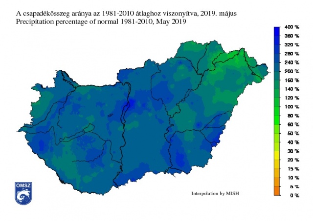 2019-ben a május rendkívül csapadékosan alakult, a Dunántúlon nagy területen 150 mm-nél is több, az Alföld nagy részén 100 és 150 mm közötti mennyiségben hullott csapadék a hónapban, de foltokban ott is előfordult ennél nagyobb érték, csak északkeleten és a Hármas-Körösnél találunk olyan térségeket, ahol a havi csapadékösszeg 100 mm alatt maradt (pl. Mándok: 63,8 mm, Gyomaendrőd: 90,2 mm). A hegységeinkben a 200 mm-t is meghaladta a havi összeg (pl. Bakonybél 246,7 mm (Bakony); Kékestető 237,2 mm (Mátra); Máza: 204,0 mm (Mecsek)), de 200 mm feletti értékek előfordultak a főváros környezetében (pl. Kőbánya: 220,5 mm), valamint Zalában (Gutorfölde: 238,6 mm) is.