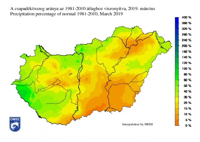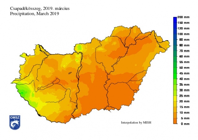 Az 1981-2010-es sokévi átlag mintegy 27%-a hullott le csupán, és ezzel a 10. legszárazabb márciust tudhattuk magunk mögött 1901 óta. A legnagyobb csapadéktöbblet (a sokévi átlag 80%-a) a délnyugati országrészben, míg a legkisebb az Alföld déli részén, valamint a Tisza felső és alsó szakaszán (0-5%) jelentkezett.