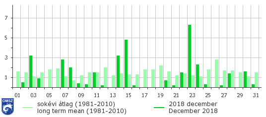 Decemberben a csapadékmennyiség az ország jelentős hányadán az 1981-2010-es sokévi átlag közelében alakult. Míg a legcsapadékosabb tájakon 20-40%-kal több csapadék hullott mint a sokévi átlag, addig Vas, Zala és Somogy megyében a szokásos mennyiségnek csupán 20-30%-a érkezett.