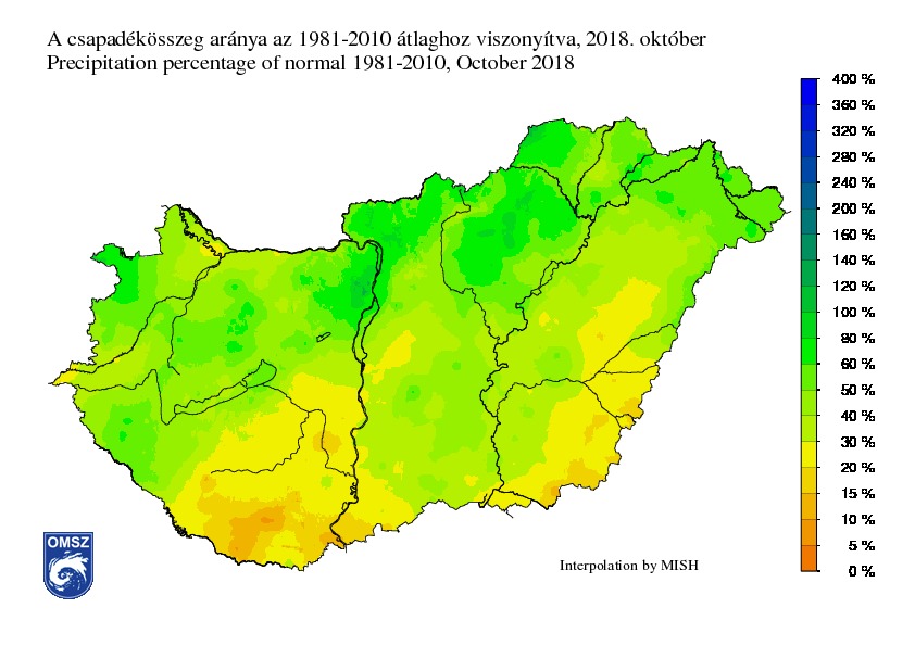A sokévi átlaghoz viszonyított legnagyobb értékek (80-100%-a) a Budai hegyek területeire és az Északi-középhegység egyes részeire koncentrálódtak, a legkisebbek pedig a Dél-Dunántúlra és a délkeleti országrészre (15-20%). Szűk területen azonban a sokévi átlag 10%-át sem érte el a havi csapadékösszeg.