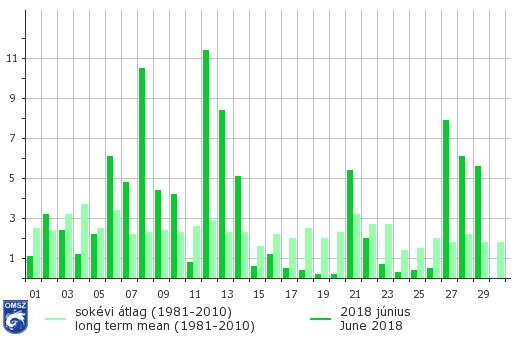 A nyár első hónapjában szinte mindennap hullott csapadék heves záporok és zivatarok formájában. Jelentősebb csapadékmennyiség egy gyenge mediterrán légörvény hatására rendezett zivatarláncokból hullott Medárd- napon (Június 8). Majd egy hidegfront előtti labilis légkörben kialakuló konvektív hullámok okoztak Június 12-13-án károkat okozó felhőszakadásokat. Ezeken a napokon országos átlagban 10 mm fölötti napi csapadékösszeg adódott. A hónap közepén uralomra jutó anticiklonnak köszönhetően az időjárásunk szárazabbá vált. Később egy markáns hidegfront áthaladása hozott komolyabb lehűlést és hozott újra csapadékot június 21-22-én. A frontot követően még labilis maradt a légkör, mely a hónap végéig teremtett kedvező körülményeket záporok, zivatarok kialakulásának.