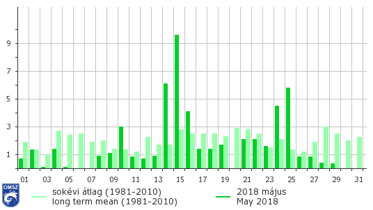 A májusi csapadékösszeg ugyan kissé elmaradt a sokéves átlagtól, azonban majdnem minden nap hullott csapadék. A hónap közepén egy alacsony nyomású képződmény hatására meglehetősen csapadékossá vált hazánk időjárása. A legnagyobb csapadékösszeg is ehhez köthető, 15-én, országos átlagban 9,7 mm csapadék hullott. Szinte a hónap végéig maradt a csapadékos időjárás, csupán a hónap utolsó 2 napja telt csapadékmentesen.