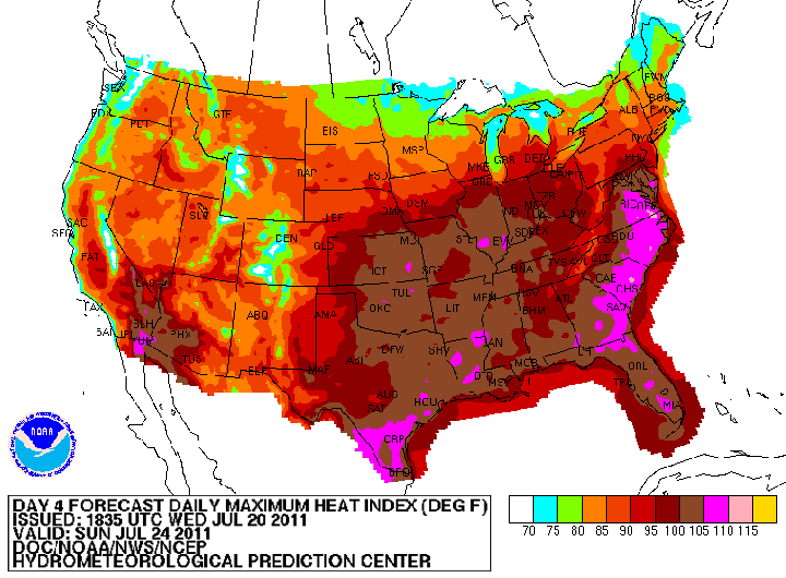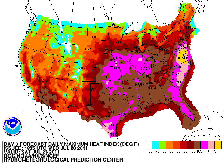 Az NWS hőség index (HI) előrejelzése (2011. július 23-ra és 24-re)