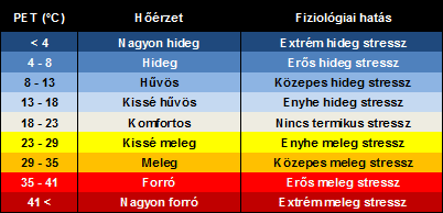 segítségével határozzák meg. Az UTCI értékeit a 2. ábrán látható módon értelmezhetjük. 1. táblázat A fiziológiailag ekvivalens hőmérséklet (PET) osztályozása a különböző hőérzet-kategóriák, illetve a fiziológiai hatás alapján (Matzarakis és Mayer, 1996) |