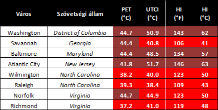 Idén, a július eleji magyarországi hőhullám idején a PET értéke Budapesten 44,8°C volt. Megállapítható tehát, hogy Magyarországon, a tengerentúlon
