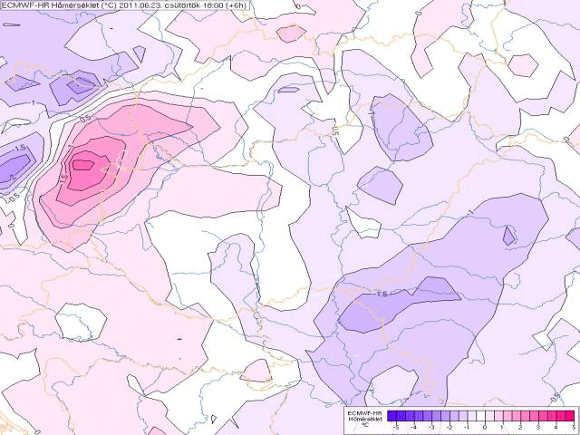 A 11. ábrán a 850 hPa-os hőmérséklet 12 UTC illetve 00 UTC modellfutása alapján számolt különbség mezeje látható. Ez alapján északnyugaton mintegy