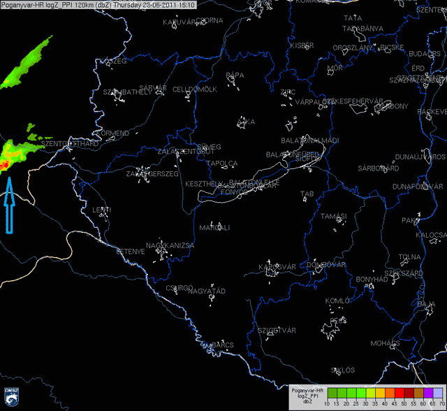 elhaltak, majd később maga a hidegfront vágta alá hideg levegőjével. A pogányvári 120-kmes méréshatárú nagyfelbontású radarkép animáción itt is jól
