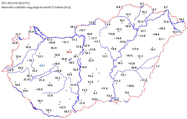 A hidegfront végül nagysebességgel átvonult az országon többfelé zivatarokat és a Dunántúl északi felében 90 km/h körüli, a Balatonnál 100 km/h-s mért