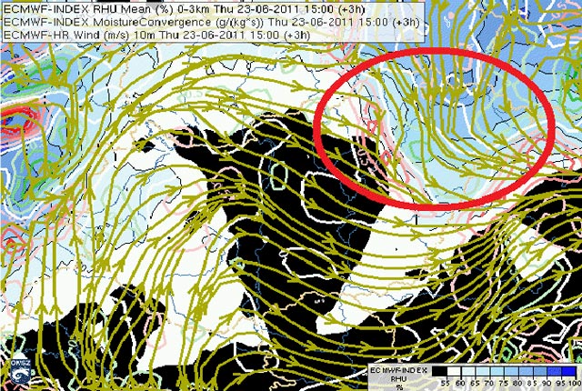 konvergencia az alsó szinteken nagyobb rétegvastagságban biztosították az erős összeáramlást az északkeleti térségben, ahol ekkorra alacsonyszinteken már