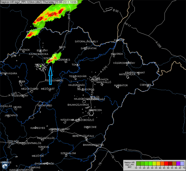 A napkori 120 km-es radaranimáció 10.55 UTC-14.40 UTC között.