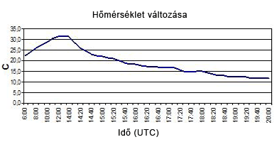 A délelőtti, kora délutáni órákban gyorsan melegedett a levegő. A hőmérséklet a délután első felében érte el a napi maximum értéket (32.4 C°, 16 óra)