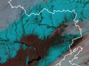 Hófelszín, kondenzcsíkok, folyók megjelenése a Kelet-európai-síkságról készült műholdképeken február 12-én reggel. |