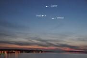 Látványos égi jelenségnek lehettek tanúi a napokban az esti eget kémlelők: napnyugtát követően a Hold, a Vénusz és a Jupiter álltak egy vonal mentén, közel egymáshoz. |