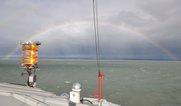 A balatoni viharjelzési szezon utolsó hetében az időjárás látványos szivárvánnyal búcsúzott a nyári félévtől. Egy északról közeledő hidegfront felhőzetére vetült ki az esőcseppeken megtörő, összetevőit megmutató napfény. A Balatonnál a viharos szél miatt másodfokú viharjelzés volt érvényben. |