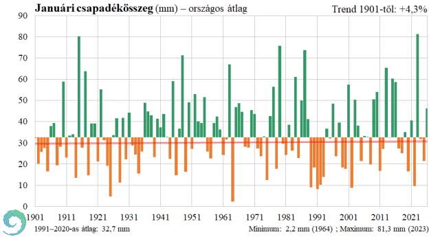 Öt enyhe január után ismét átlag alatt alakult az év első hónapja, az elmúlt 15 évben csak a 2017-es január volt hidegebb. Hazánk nagy részén -1 és -3 fok között adódott a hónap középhőmérséklete; ennél magasabb értékek délen, alacsonyabbak északon fordultak elő.