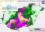 Éjszaka az ország középső részén - nagyjából a Budapest-Kiskunhalas vonal szélesebb sávjában - több helyen alakultak ki felhőszakadást okozó zivatarok. Voltak olyan területek, amiket az észak felé helyeződő zivatarcellák többször is érintettek, így összességében ismét jelentős csapadékot hagytak maguk mögött. |