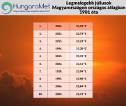 Az 1901-től elemzett júliusok sorában első helyre került 2024 júliusa. A mérési sor a HungaroMet Zrt. éghajlati adatbázisán alapuló, homogenizált (MASH) és interpolált (MISH) júliusi országos átlagokból áll. Az idei, rekordmeleg július (24,5°C) segítségével szemléletessé tudjuk tenni, hogy mi vár ránk a jövőben. Ehhez az éghajlatváltozás hazai hatásainak feltérképezését szolgáló KlimAdat projektben elérhető, a HungaroMet Zrt-nél előállított klímamodell-szimulációk együttesének tükrében értékeltük a 2024. júliusi középhőmérsékletet. |