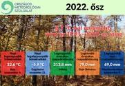 Az Országos Meteorológiai Szolgálat mérései alapján a 2022-es ősz az 1991–2020-as átlagnál 0,7 Celsius fokkal melegebb volt, ezzel a tizenkilencedik legmelegebb 1901 óta. Nagy hőmérsékleti kilengések nélkül, de hosszú vénasszonyok nyarával vagy indián nyárral telt az évszak, és három nagyon száraz évszak után 2022 őszén országosan átlagos mennyiségű csapadék hullott. |