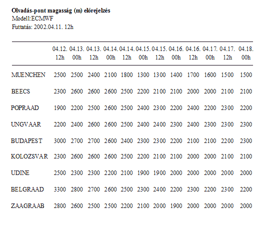 - 6 napra előre a 0 fok magasságának várható alakulását tizenkét órás bontásban novembertől májusig (4. táblázat)