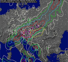 2/a., 2/b. ábra A 2009.03.30. 00 UTC-s dinamikus telítési hiány (bal oldalon) és a 2009.03.29. 18 UTC-től 03.30. 06 UTC-ig lehullott csapadék (jobb oldalon) analízise | |