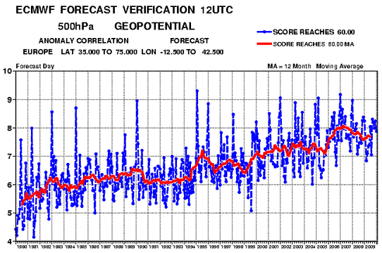 Az ECMWF modell beválásának a javulása 1980-tól 2009-ig